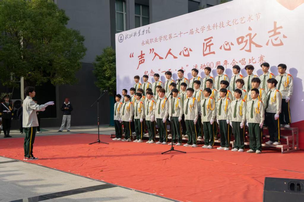 赛场上,来自各系的参赛队伍身着统一服装,精神抖擞、意气风发,以饱满的热情展现新时代大学生的青春风貌。比赛设置限选曲目与自选曲目两个环节,各代表队在完成必唱曲目《光荣啊,中国共青团》的基础上,纷纷献上精心准备的自选作品。《保卫黄河》的激昂旋律奏响时,歌声如黄河怒涛般雄浑壮阔,唱出了中华民族不屈不挠的抗争精神;《歌唱祖国》的熟悉曲调响起,全场师生不自觉跟随哼唱,字里行间满是对祖国母亲的深情眷恋;《在太行山上》则以悠远深沉的唱腔,再现了革命先辈在烽火岁月中的坚定信念。同学们用嘹亮的歌声、真挚的情感和富有创意的编排,将一首首红色经典演绎得淋漓尽致,每一个音符都承载着对历史的铭记,每一段旋律都传递着对未来的憧憬,赢得了现场评委和观众的阵阵掌声与喝彩。